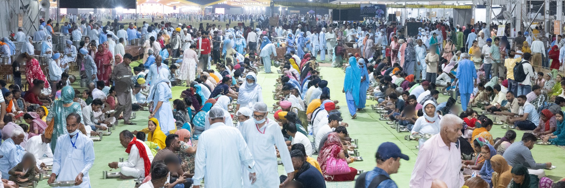 As the sun set, streams of lights lit up the grounds, and devotees staying at the center were joined by local attendees who commuted to and from the venue. In no time, the event grounds were buzzing! The main event tents, spanning 84,000 square feet, were decorated with colorful bands of fabric and spherical pendant lights to match the festive ambience. In the middle of the tent, a pathway adorned with rangoli and flower garlands led to Sant Baljit Singh Ji’s dais. At the entrance canopy of the tent, a huge flag of God Hanuman was mounted. Attendees, upon arriving, often first paid their respects to God Hanuman before taking their seats.
