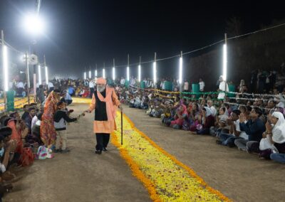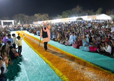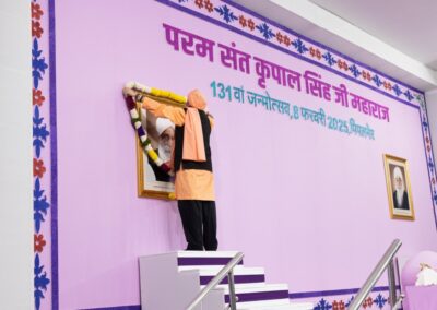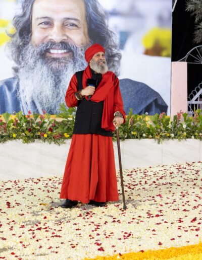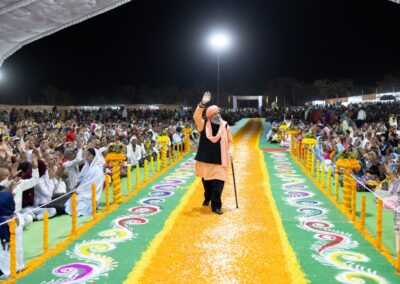 The entire pathway to the dais was beautifully decorated with flower petals, intricate rangoli, and colorful tinsels. Many attendees lined the pathway on both sides, excitedly awaiting the arrival of Sant Baljit Singh Ji. Some even sat on the adjacent hills along the way. As Sant Baljit Singh Ji walked along the pathway, his sight brought palpable joy to everyone. He greeted attendees by frequently raising his arm and outstretching it toward them. While attendees seated along the pathway watched him up close, those sitting in the main event tent watched his arrival on the LED screens.